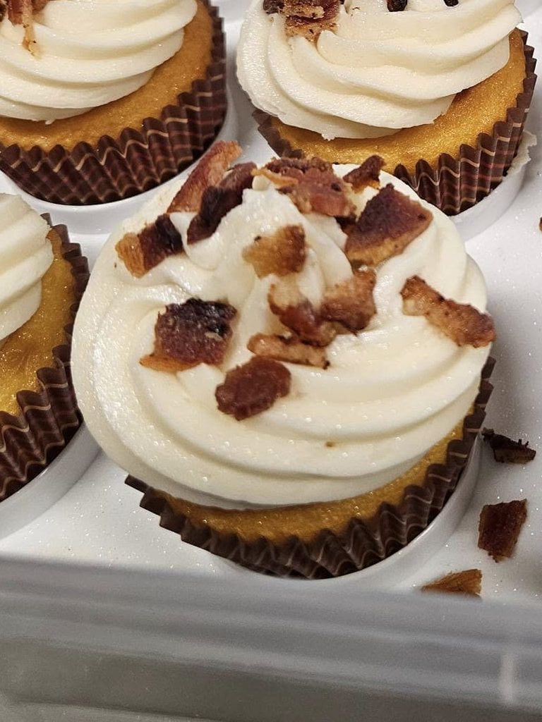 - Yellow cake with a sweet maple buttercream, topped with crumbles of savory bacon.